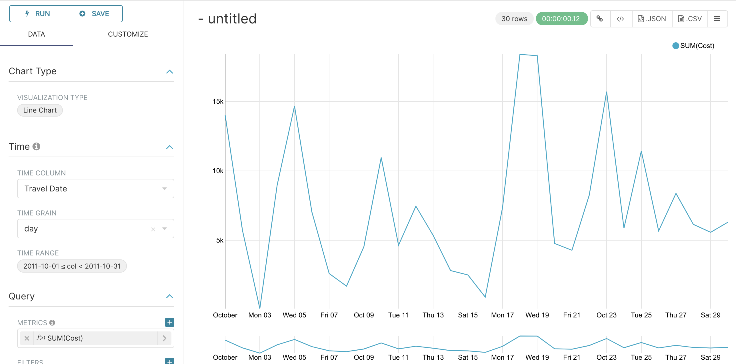 Next, in the query section, change the Metrics to the sum of Cost. Select Run Query to show the chart. You should see the total cost per day for each month in October 2011.