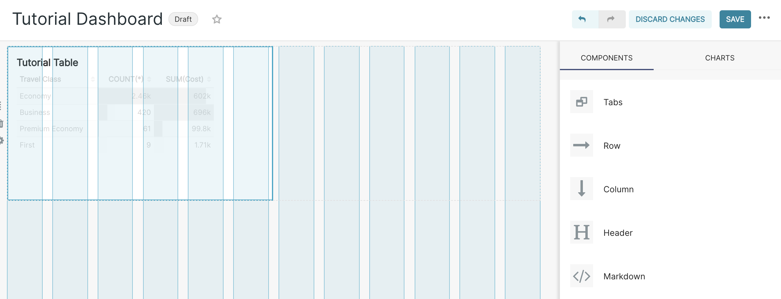 In this section, we'll create a table visualization to show the number of flights and cost per travel class.